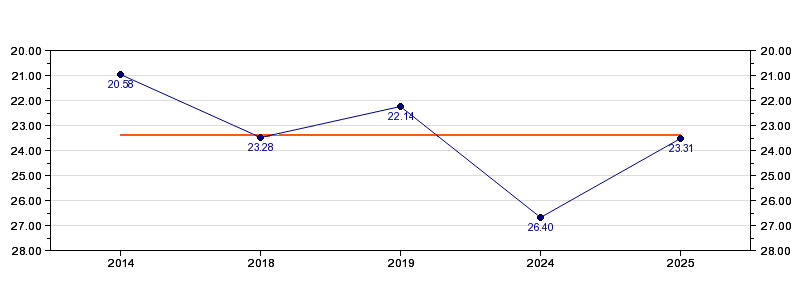 | Antall deltagelser | 5 (i perioden 2014 - 2025) |