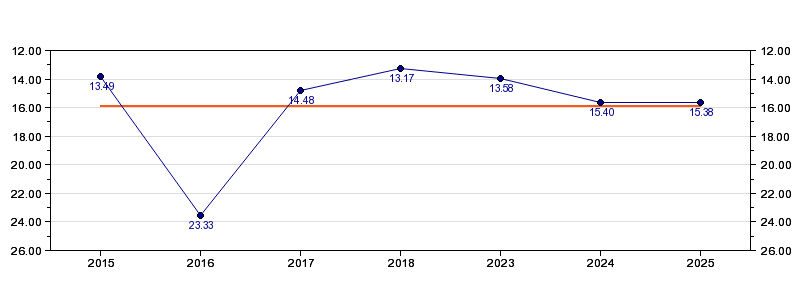 | Forrige tid | 15.38 (2025) |