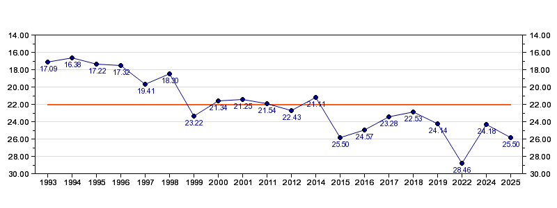 | Antall deltagelser | 20 (i perioden 1993 - 2025) |