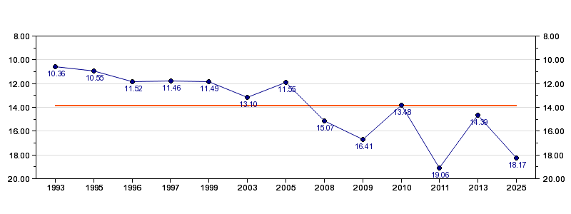 Antall deltagelser13 (i perioden 1993 - 2025)