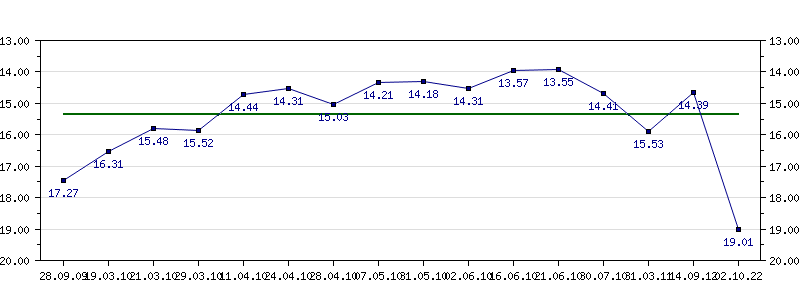 | 30.07.2010 | 14.41 | 31.03.2011 | 15.53 | 14.09.2012 | 14.39 | 02.10.2022 | 19.01 |