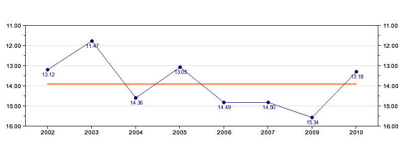 | Forrige tid | 13.18 (2010) |