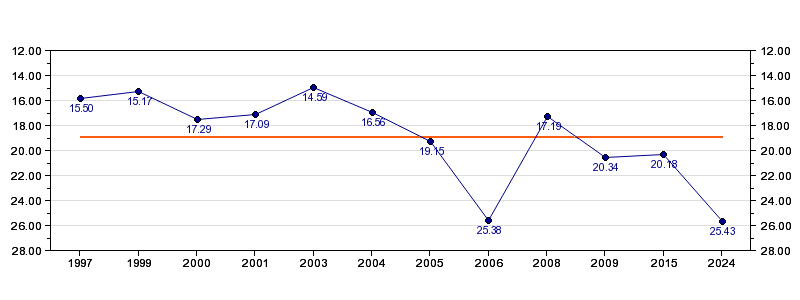 Antall deltagelser12 (i perioden 1997 - 2024)