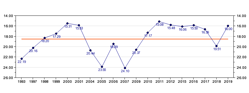 Antall deltagelser19 (i perioden 1993 - 2019)