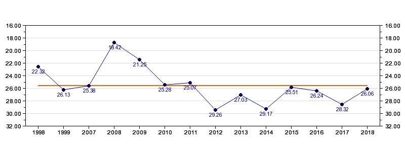 Antall deltagelser14 (i perioden 1998 - 2018)