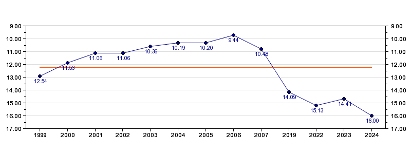 Antall deltagelser13 (i perioden 1999 - 2024)