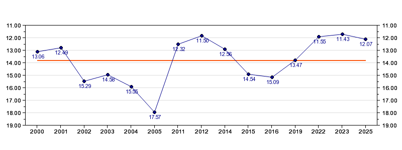 Antall deltagelser15 (i perioden 2000 - 2025)