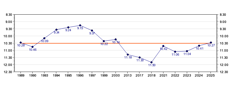 | Forrige tid | 10.27 (2025) |