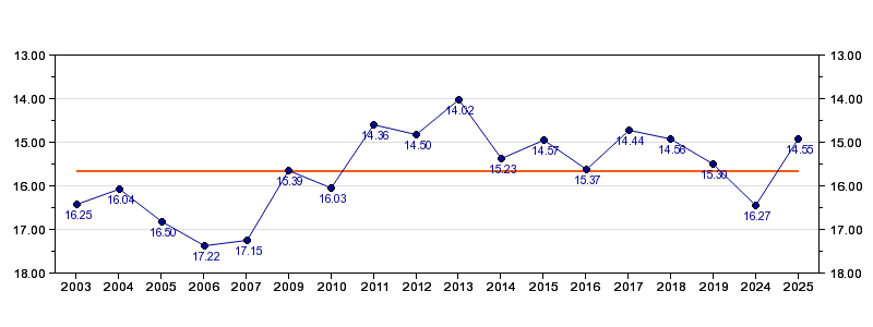 Antall deltagelser18 (i perioden 2003 - 2025)
