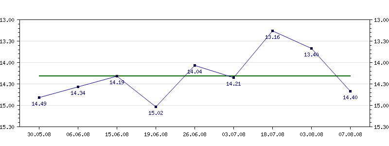| 30.05.2008 | 14.49 | 06.06.2008 | 14.34 | 15.06.2008 | 14.19 | 19.06.2008 | 15.02 | 26.06.2008 | 14.04 | 03.07.2008 | 14.21 |
