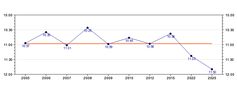 | Forrige tid | 11.50 (2025) |