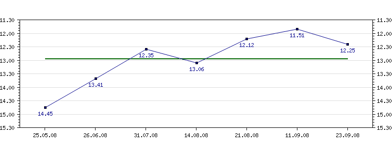 | 25.05.2008 | 14.45 | 26.06.2008 | 13.41 | 31.07.2008 | 12.35 | 14.08.2008 | 13.06 | 21.08.2008 | 12.12 | 11.09.2008 | 11.51 |