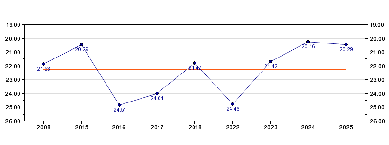 | Forrige tid | 20.29 (2025) |