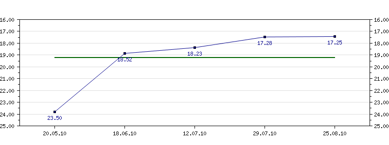 | 20.05.2010 | 23.50 | 18.06.2010 | 18.52 | 12.07.2010 | 18.23 | 29.07.2010 | 17.28 | 25.08.2010 | 17.25 |