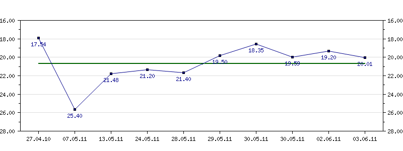 | 27.04.2010 | 17.54 | 07.05.2011 | 25.40 | 13.05.2011 | 21.48 | 24.05.2011 | 21.20 | 28.05.2011 | 21.40 | 29.05.2011 | 19.50 |