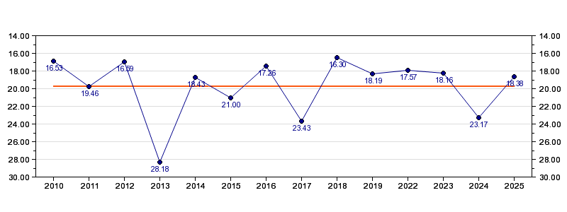 | Forrige tid | 18.38 (2025) |