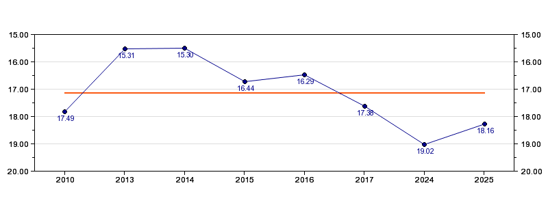 | Forrige tid | 18.16 (2025) |