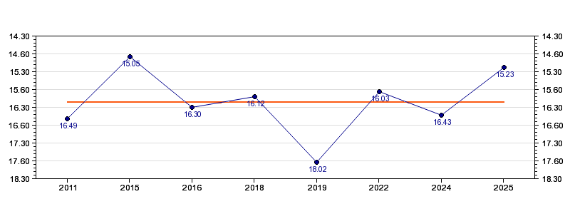 | Forrige tid | 15.23 (2025) |