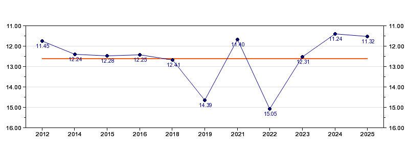 Antall deltagelser11 (i perioden 2012 - 2025)