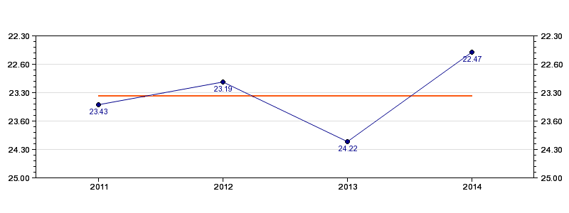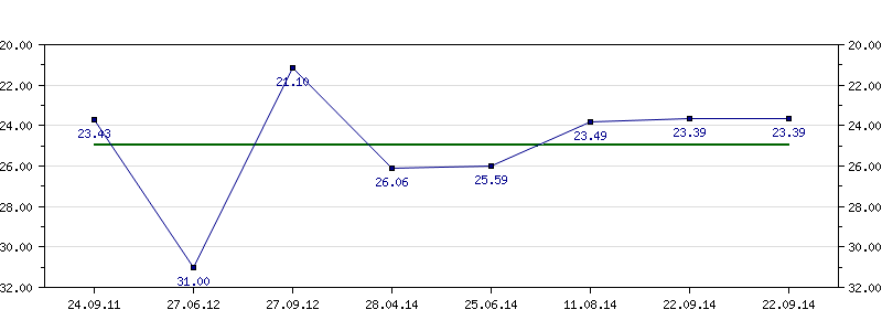 | 24.09.2011 | 23.43 | 27.06.2012 | 31.00 | 27.09.2012 | 21.10 | 28.04.2014 | 26.06 | 25.06.2014 | 25.59 | 11.08.2014 | 23.49 |