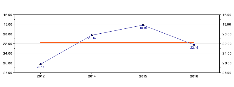 | Forrige tid | 22.16 (2016) |