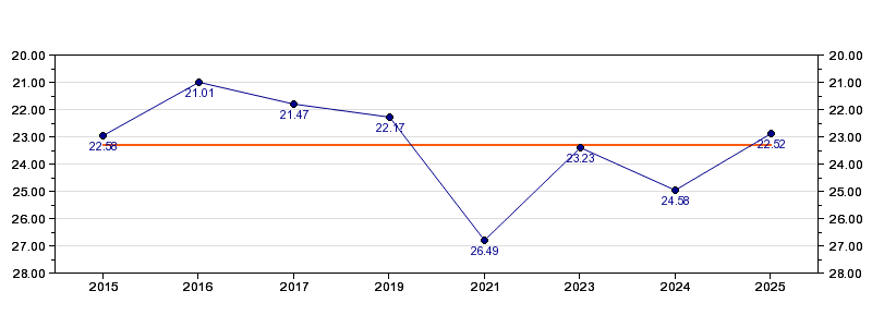 | Forrige tid | 22.52 (2025) |