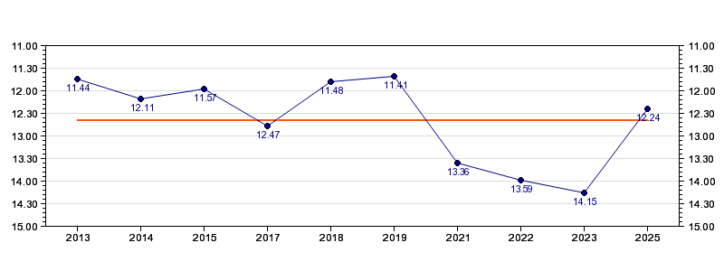 | Forrige tid | 12.24 (2025) |