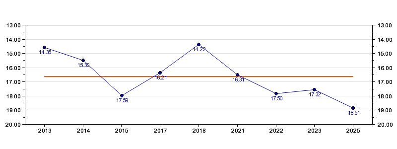 Antall deltagelser9 (i perioden 2013 - 2025)