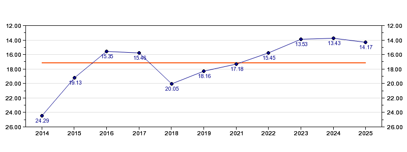 Antall deltagelser11 (i perioden 2014 - 2025)
