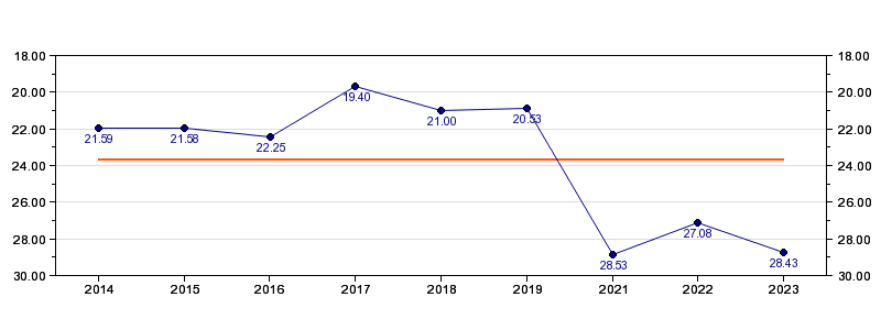 | Forrige tid | 28.43 (2023) |