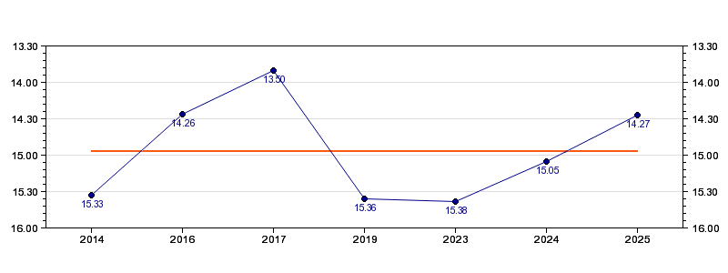 Antall deltagelser7 (i perioden 2014 - 2025)
