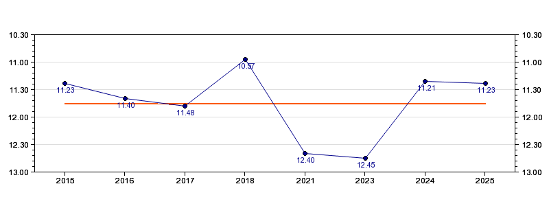 | Forrige tid | 11.23 (2025) |