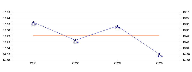 | Forrige tid | 14.00 (2025) |