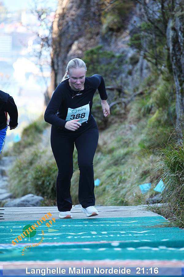 Da Thorbjørn Ludvigsen satte rekord på 7.54 i 2016 hadde han serien 95-99-95-115 og en gjennomsnittlig vertikal hastighet på 2286 meter/time. Kristin Størmer Steira hadde serien 107-96-95-107 da hun satte damerekord på 9:35 i 2013 med en gjennomsnittlig vertikal hastighet på 1884 meter/time. Til sammenligning hadde verdensrekordløpene på en vertikal kilometer (per 1/8/2014) hastighet på henholdsvis 1967 meter/time og 1630 meter/time - men da ble det altså løpt mer enn 3 ganger så langt.