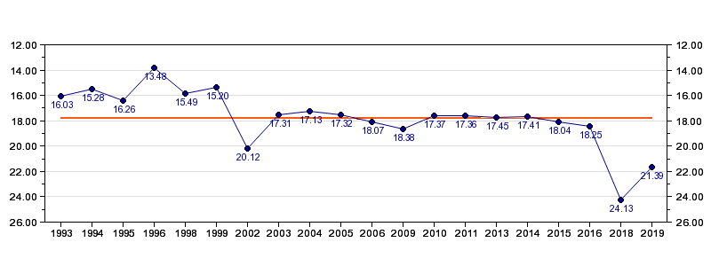 | Antall deltagelser | 20 (i perioden 1993 - 2019) |