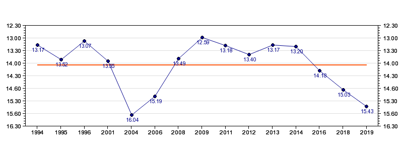 Antall deltagelser15 (i perioden 1994 - 2019)