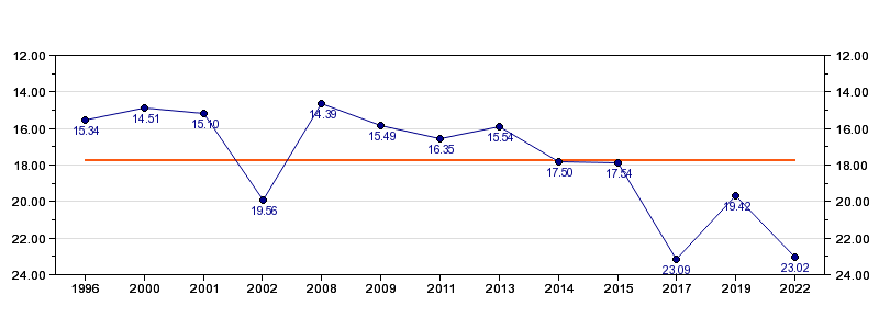 Antall deltagelser13 (i perioden 1996 - 2022)