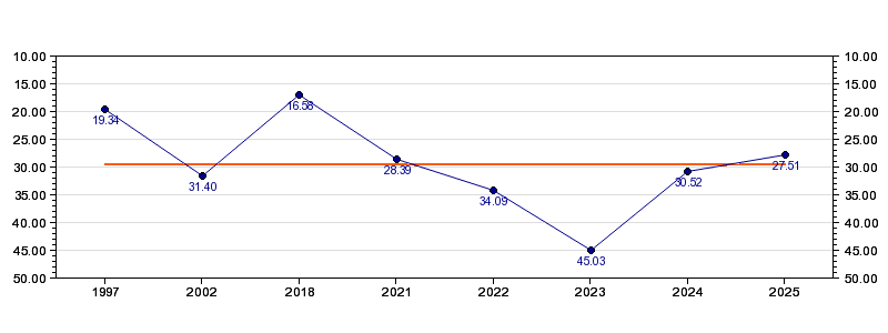 Antall deltagelser8 (i perioden 1997 - 2025)
