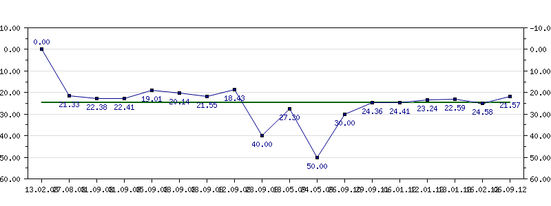 | 29.09.2011 | 24.36 | 06.01.2012 | 24.41 | 12.01.2012 | 23.24 | 18.01.2012 | 22.59 | 16.02.2012 | 24.58 | 06.09.2012 | 21.57 |