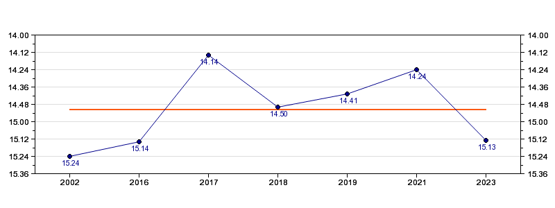 | Forrige tid | 15.13 (2023) |