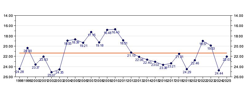 Antall deltagelser27 (i perioden 1998 - 2025)