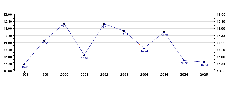 Antall deltagelser10 (i perioden 1998 - 2025)