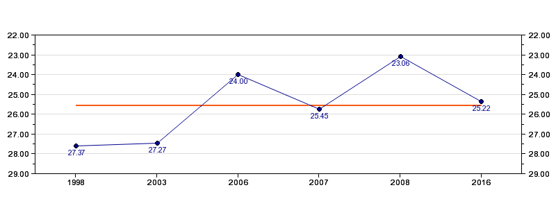 | Forrige tid | 25.22 (2016) |