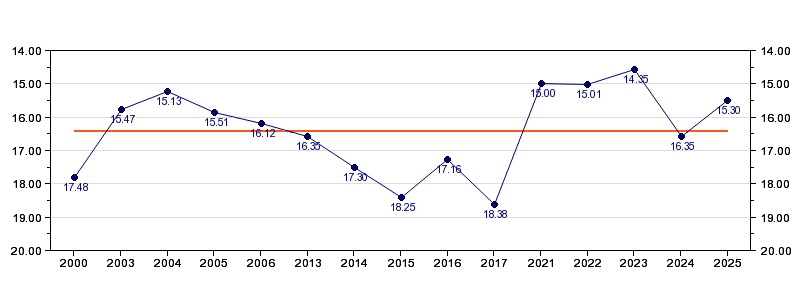 | Antall deltagelser | 15 (i perioden 2000 - 2025) |
