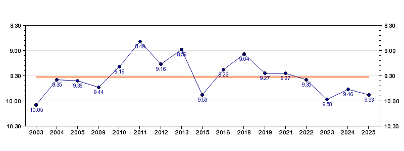 | Forrige tid | 09.53 (2025) |