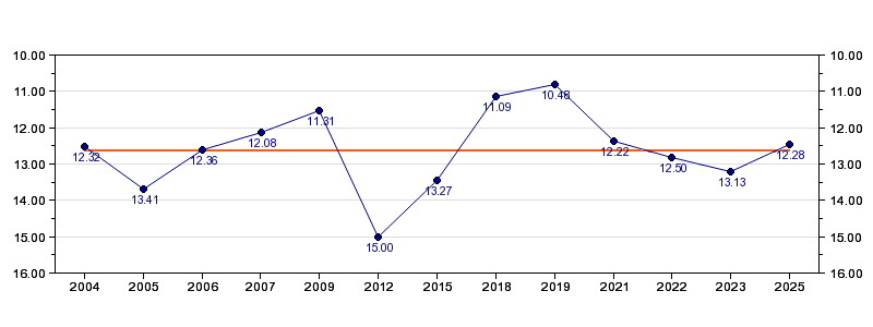 Antall deltagelser13 (i perioden 2004 - 2025)
