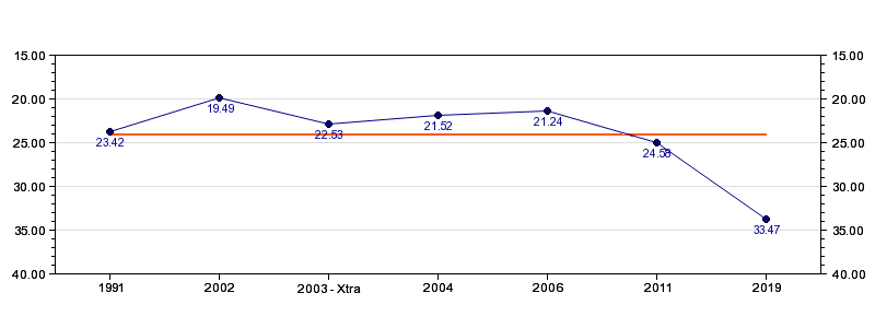 | Forrige tid | 33.47 (2019) |