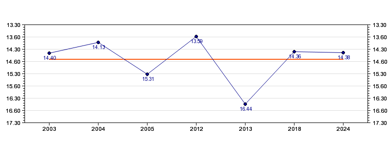 | Forrige tid | 14.38 (2024) |
