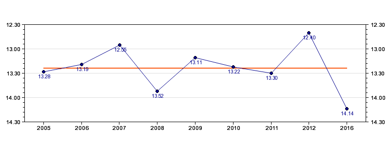 | Forrige tid | 14.14 (2016) |