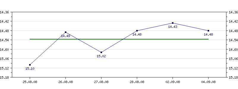 | 25.08.2008 | 15.10 | 26.08.2008 | 14.49 | 27.08.2008 | 15.02 | 28.08.2008 | 14.48 | 02.09.2008 | 14.43 | 04.09.2008 | 14.48 |